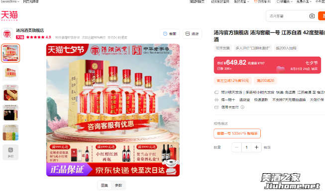 根据上图汤沟官方旗舰店的售价,整箱(1*6)的汤沟窖藏一号42度酒浓香型,七夕价是650元。