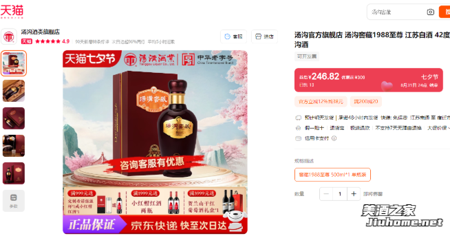 根据上图的图片显示,旗舰店的汤沟窖藏1988至尊版的单瓶七夕售价是246.8元,该酒是42度浓香型,属于优级酒水。